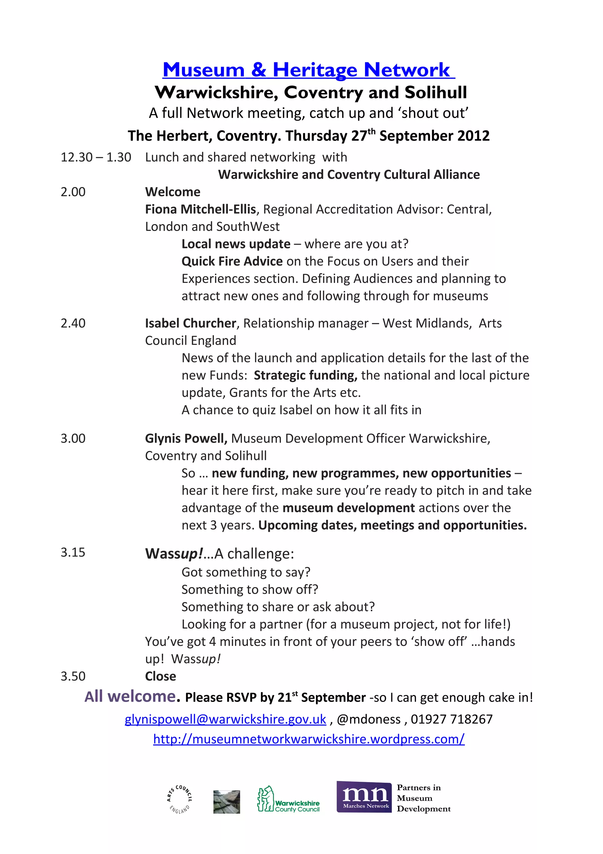 The document announces a full network meeting for museum professionals in Warwickshire, Coventry and Solihull on September 27th. The agenda includes updates on local museum news, advice on defining audiences and attracting new ones, and information from Arts Council England on new funding opportunities. Attendees will also hear about new museum development programs and opportunities over the next three years, and have a chance to showcase projects or ask questions to their peers.