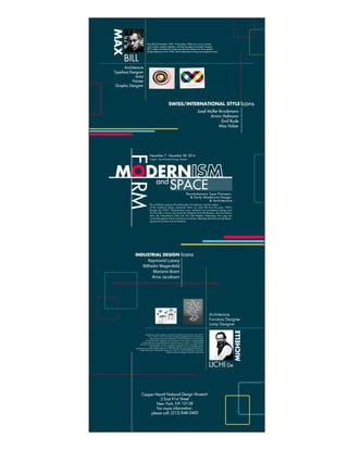 This exhibition at the Cooper-Hewitt National Design Museum explores the impact of modernist design from the early 1900s through the 1970s. It shows revolutionary print, industrial, and architectural designs that emerged after the Arts and Crafts movement, including the works of designers from the Bauhaus, Swiss Movement, International Style, and late modern advertising eras. Through actual working environments of the time featuring period furniture and architecture, the exhibition analyzes how modernist design influenced daily life and style.