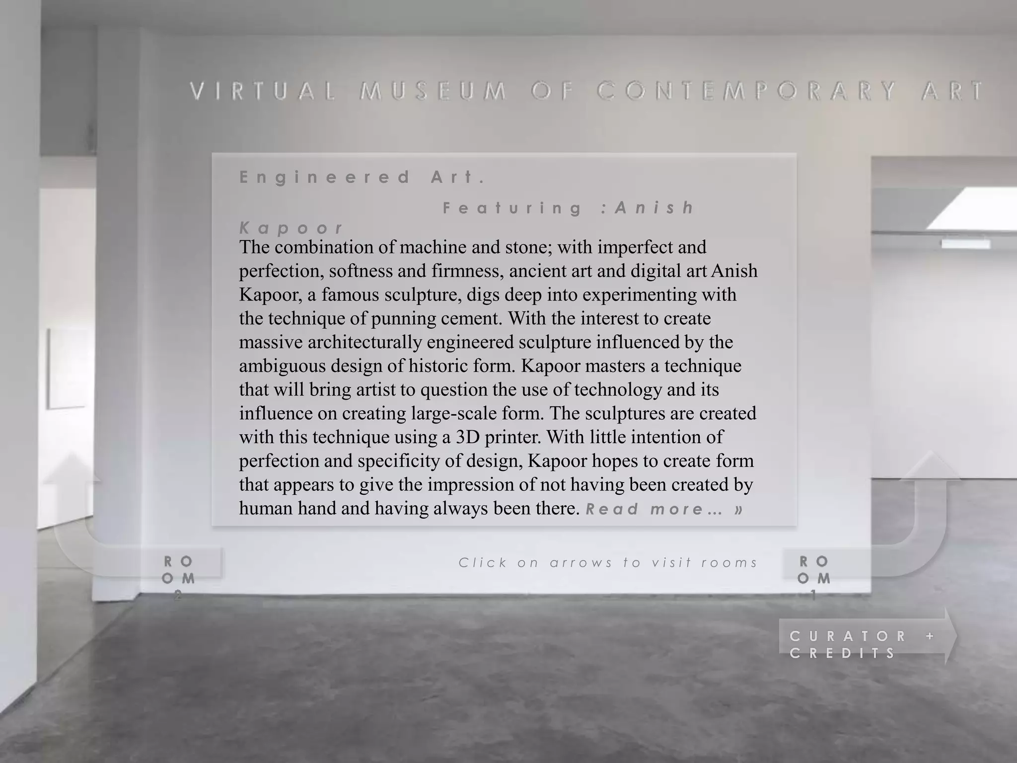 Anish Kapoor is a famous sculptor known for experimenting with cement extrusion techniques and 3D printing to create large-scale sculptures. He aims to generate ambiguous forms that appear to have existed naturally for a long time, rather than being clearly human-made. Kapoor combines new technologies with traditional materials like cement to challenge notions of what art is and question the influences of modern techniques on artistic creation and perception.