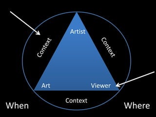 The document discusses the history and development of museums from ancient Greece to the modern era. It begins with the Mouseion in Alexandria which was a center for research and collection of objects. It then covers religious sites and private collections that evolved into public museums during the Enlightenment. The document examines how museum displays frame our understanding of cultures through choices of objects, grouping, lighting, and other framing devices.