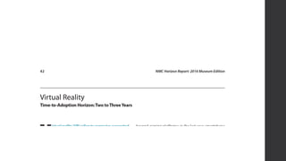 Four trends are accelerating change in U.S. museums: 1) indoor navigation and location-based services, 2) new ways of seeing like 360 video, 3D, AR, VR, 3) external pressure from grassroots initiatives and network effects on social media, 4) internal pressure to undergo a digital transformation and develop a digital culture. Museums are experimenting with technologies like indoor maps, augmented and virtual reality to improve the visitor experience, while social media activism and informal networks also influence museums to change and adopt digital strategies.