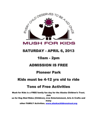 The event is a free family fun day called Mush for Kids at Pioneer Park from 10am to 2pm on Saturday, April 6, 2013 for children ages 4 to 12, with dog sled rides, live entertainment, arts and crafts, and other family activities to benefit the Alaska Children's Trust.