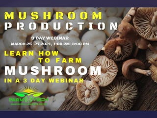 The document then discusses factors to consider such as technology, working space, raw materials, labor, budget, and market before starting a mushroom cultivation business. It provides details on culture preparation, substrate preparation, filling/heat treatment, spawn run, fruiting, and harvesting. Floor plans and