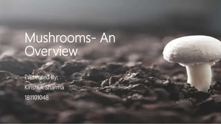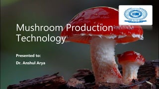 Mushroom production technology was presented to Dr. Anshul Arya. Mushrooms are fleshy, spore-bearing fruiting bodies of fungi that do not contain chlorophyll and depend on other plants for nutrients. The main parts of mushrooms include the pileus, volva, lamellae, annulus, mycelial threads, scale, and stipe. Mushroom cultivation began over 1000 years ago in China and has since expanded, with India now producing around 1.3 lakh tonnes annually, mostly of button, oyster, paddy straw, and milky mushrooms. Mushrooms are cultivated for food, agricultural waste utilization, employment, and their nutritional benefits such as protein, vitamins, minerals