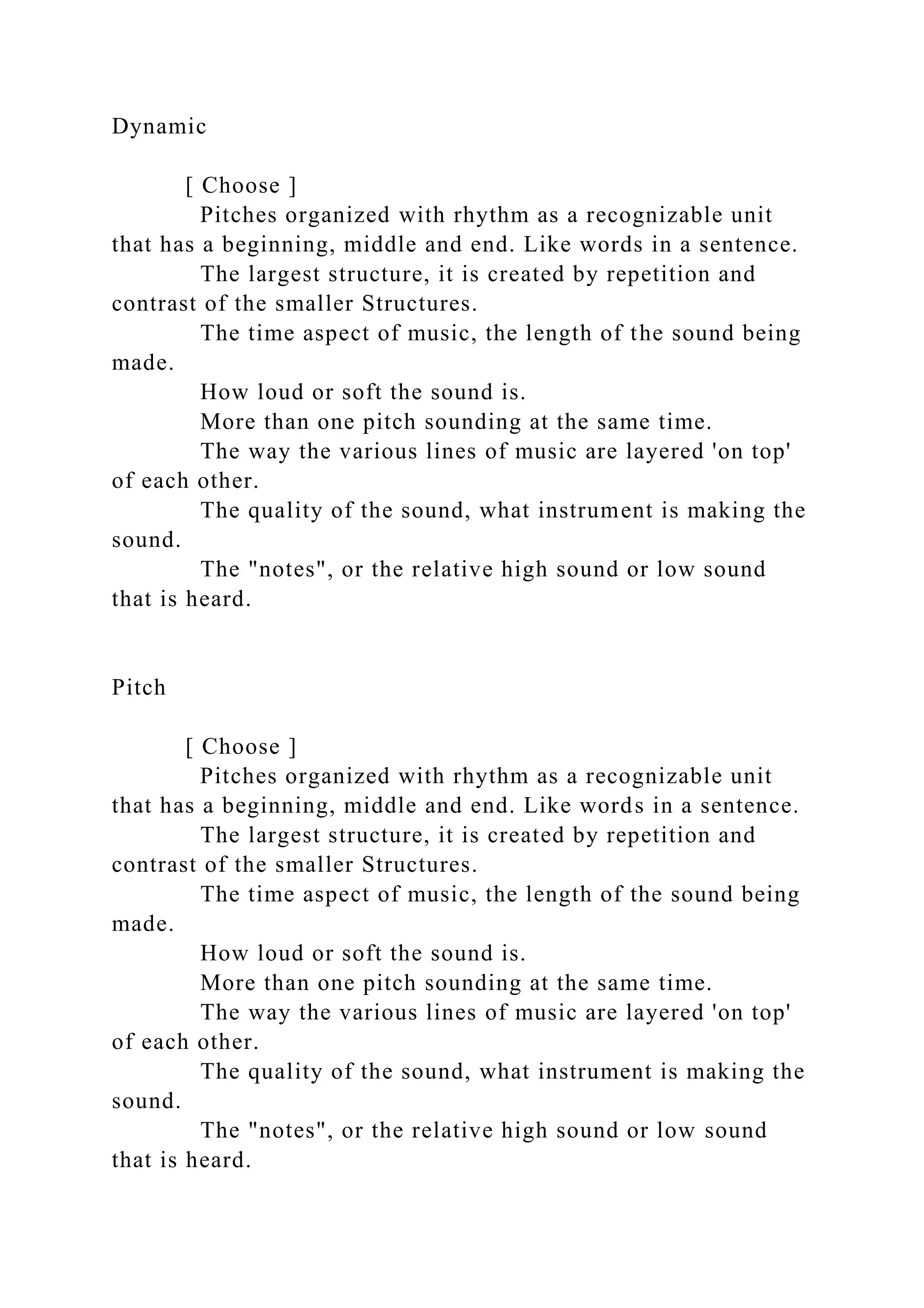 The document contains a series of questions and definitions related to music terminology such as dynamics, pitch, melody, rhythm, and harmony, along with practical exercises focused on musical terms and concepts. Additionally, it discusses the concepts of analysis of variance (ANOVA) in statistical studies, demonstrating how to compare means across groups while controlling for errors. It illustrates procedures for computing sums of squares, degrees of freedom, and p-values using Excel, providing an APA-style conclusion based on statistical results.