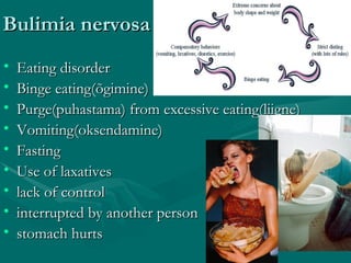 Bulimia nervosa is an eating disorder characterized by binge eating followed by purging through vomiting or laxative use. People with bulimia nervosa feel a lack of control over their eating which is often triggered by emotions and interrupted by others. Left untreated, bulimia nervosa can lead to dental problems, electrolyte imbalances, and rupture of the stomach or intestines. It typically develops during late adolescence or early adulthood and affects mostly women.