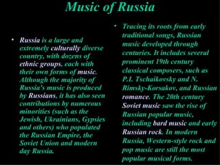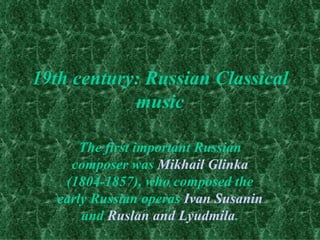 Mikhail Glinka (1804-1857) was the first major composer of classical music in Russia. He composed two important early Russian operas, Ivan Susanin and Ruslan and Lyudmila. Glinka's operas incorporated Russian folk music elements and helped establish a national style of classical music in Russia. His works were influential in the development of later Russian composers in the 19th century such as Tchaikovsky and Rimsky-Korsakov.