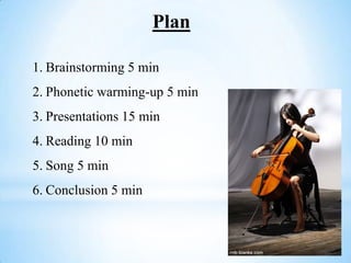 This document contains the plan for an English lesson on the mysterious world of music for an 8th grade class. The plan includes brainstorming, phonetic warming-up, student presentations on different music genres, reading a song, and a conclusion. Students will be graded based on music keys representing their understanding. The lesson covers pop, classical, rock, and folk music genres and features the Beatles song "Yesterday". Homework includes researching unusual music groups for high-scoring students, retelling a text for mid-scoring students, and asking questions about the text for lower-scoring students.