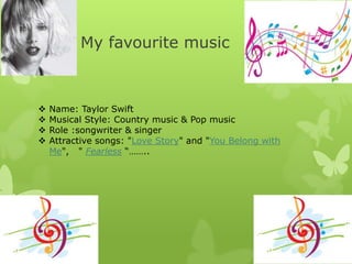 Taylor Swift is an American singer and songwriter known for her narrative songs about her personal life that have received significant media attention. She began her career in country music but has incorporated more pop elements into her music over time. Some of her most popular and attractive songs include "Love Story," "You Belong with Me," and songs from her "Fearless" album. Swift draws inspiration from her own life experiences when songwriting and has won numerous awards, including multiple Grammys, for her music. She has sold over 40 million albums and 130 million digital singles worldwide.