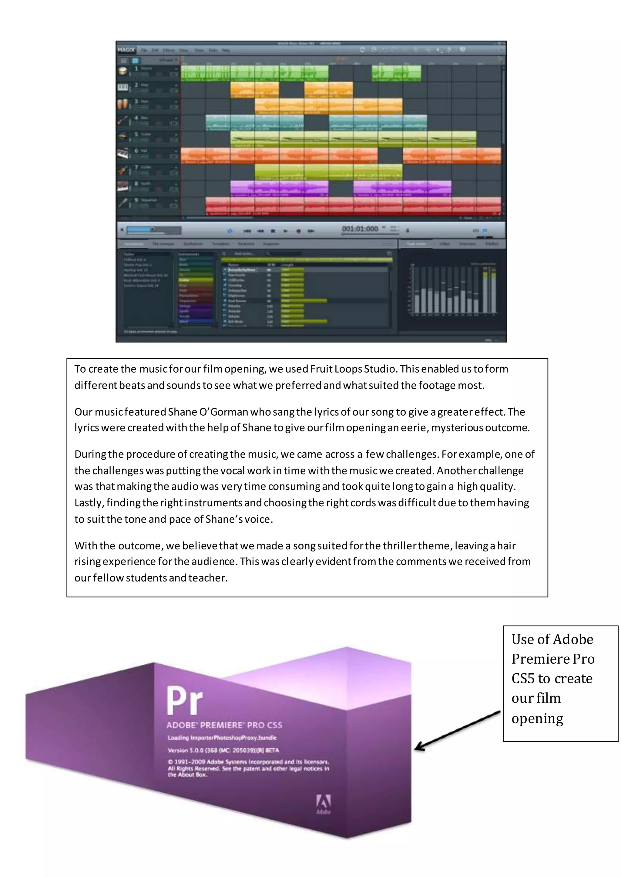 The document discusses the process of creating music for a film opening using FruitLoopsStudio. This allowed the creators to experiment with different beats and sounds to see what suited the footage best. Their music featured Shane O'Gorman singing lyrics to add more effect. The lyrics were created with Shane's help to give the opening an eerie, mysterious feel. Some challenges in the process included syncing the vocals to the music, the time-consuming nature of audio production, and choosing instruments and chords that suited Shane's voice and the tone of the piece. Based on positive feedback, the creators believe they achieved a thriller-themed song that left viewers with a chilling experience.