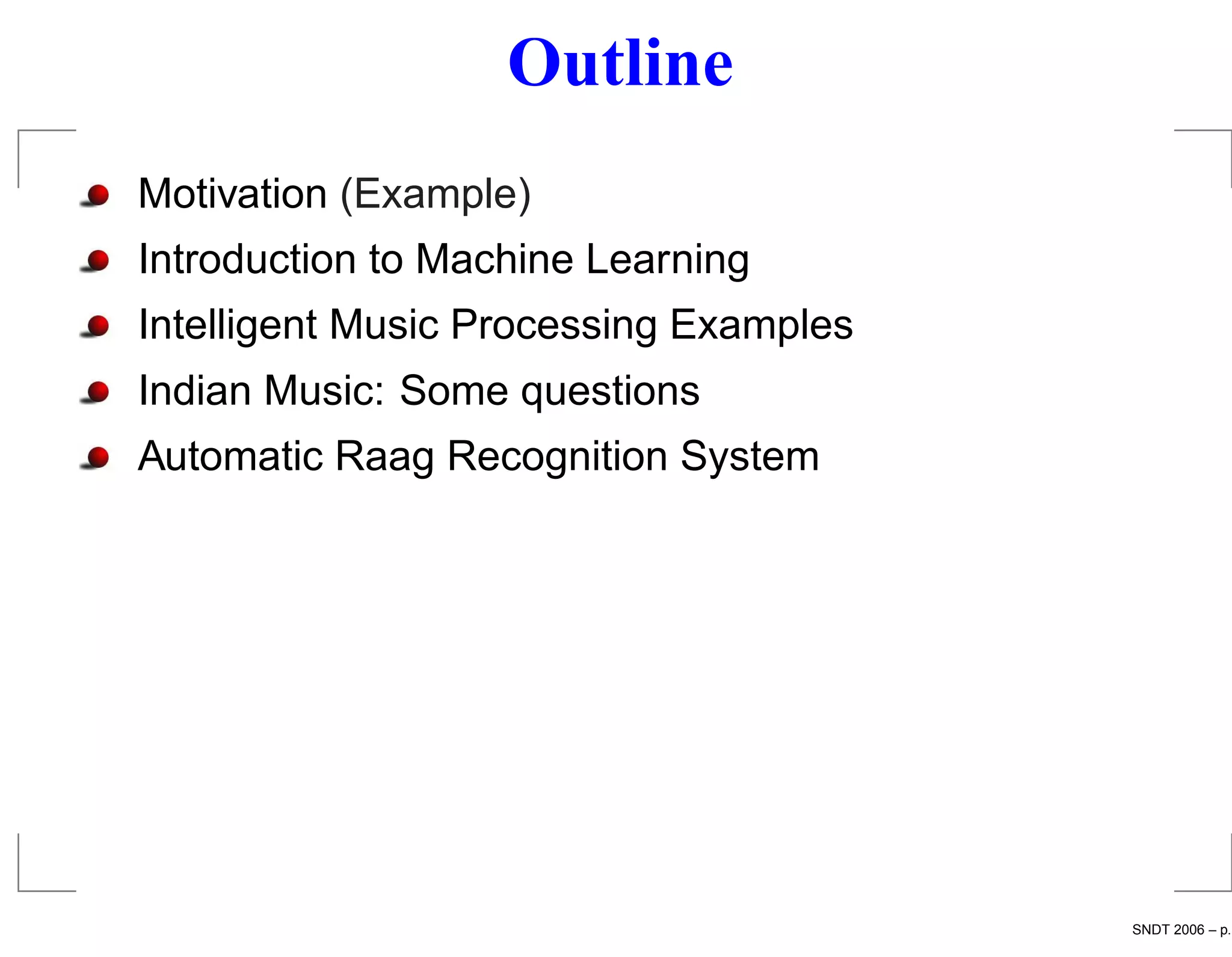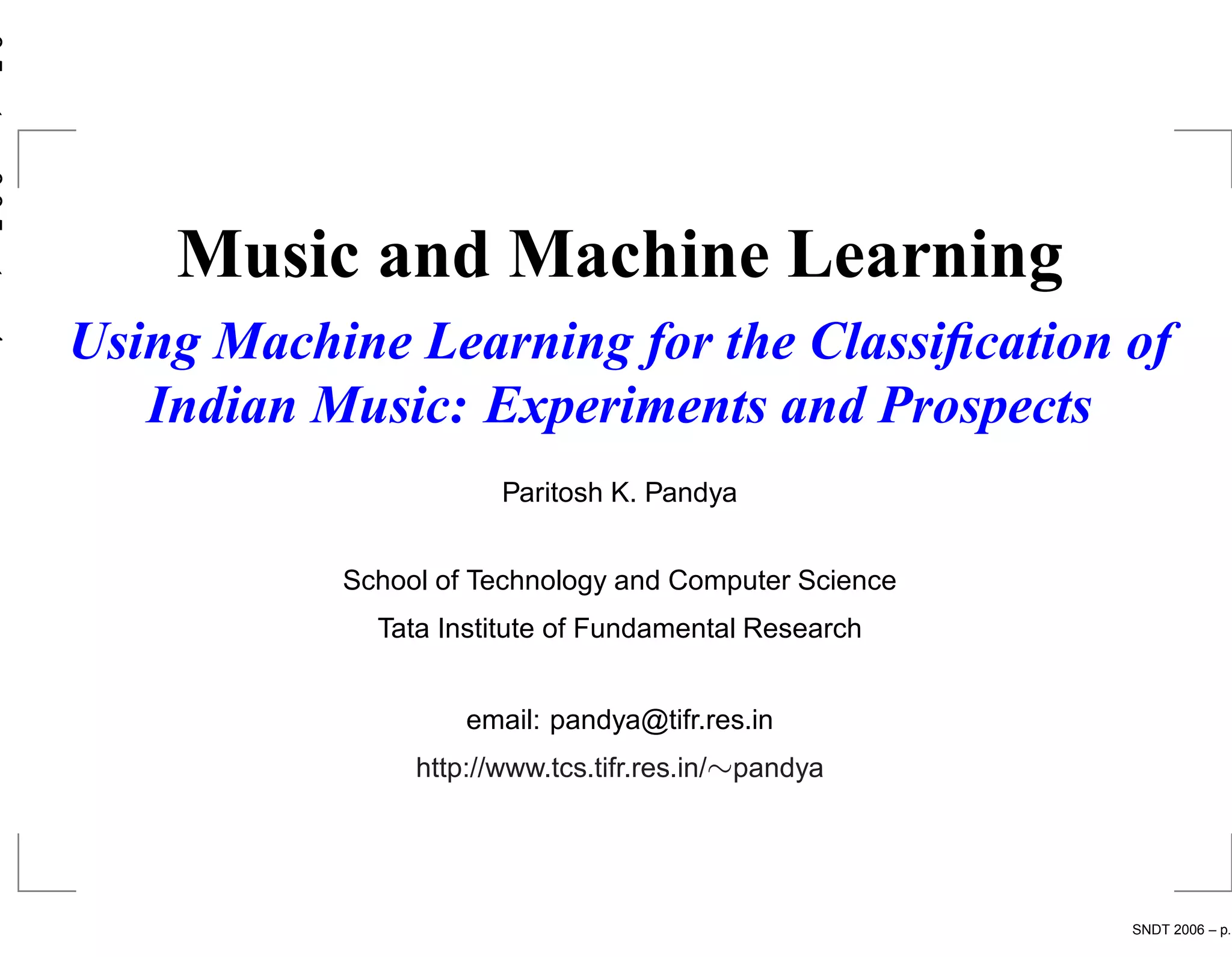 This document discusses using machine learning techniques for classifying Indian music. It provides examples of applying supervised learning methods like neural networks to tasks like raag recognition, composer identification, and melody tracking. The document also proposes representing Indian music structures like ragas and talas in a structured format to enable applications like music visualization, composition and query processing. Automatic recognition of ragas is framed as a sequential pattern classification problem that can use hidden Markov models.