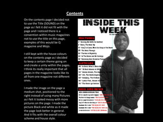 The document describes the process of creating a music magazine, including researching existing magazines for layout inspiration, choosing a target audience of 16-30 year olds interested in rock and indie music, and using promotions like free CDs to attract buyers. Key aspects like the cover photo, layout, and distribution through a company like Bauer Media were modeled after successful existing magazines. Overall, the creator learned important skills in photography, design software, and the magazine production process through completing this project.