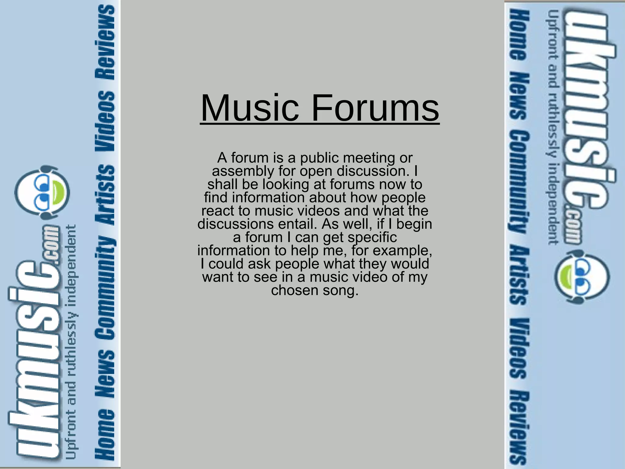 This document discusses music forums and how they can be used to gather information and feedback about music videos. It provides screenshots of forum pages where people can discuss music news, interviews, reviews and specific artists. Forum members are able to start threads on different genres and artists to share their opinions. The document explains that researching these forums would help gather public impressions to inform the creation of a new music video.