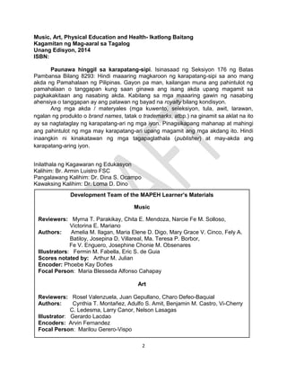 Ang dokumento ay naglalaman ng mga kagamitan sa pagtuturo para sa asignaturang Musika, Sining, Edukasyong Pisikal, at Kalusugan para sa ikatlong baitang na inihanda ng Kagawaran ng Edukasyon ng Pilipinas. Naglalaman ito ng mga aralin, aktibidad, at pagsusuri na naglalayong paunlarin ang kasanayan ng mga mag-aaral sa musika at iba pang sining. Ang mga guro ay hinihimok na makipag-ugnayan sa kagawaran para sa mga mungkahi at puna upang mapabuti ang mga materyales.