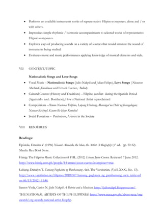 This music teaching guide outlines a lesson on two types of composed vocal Filipino music - nationalistic songs and love songs. It introduces four representative compositions: Marangal na Dalit ng Katagalugan by Julio Nakpil and Lupang Hinirang by Julian Felipe as examples of nationalistic songs, and Nasaan Ka Irog? by Nicanor Abelardo and Gaano Ko Ikaw Kamahal by Ernani Cuenco as examples of love songs. The lesson aims to analyze how the musical elements in these songs express patriotism or love, and how they reflect Philippine history, culture and society. Students will participate in activities like musical charades and complete charts to analyze