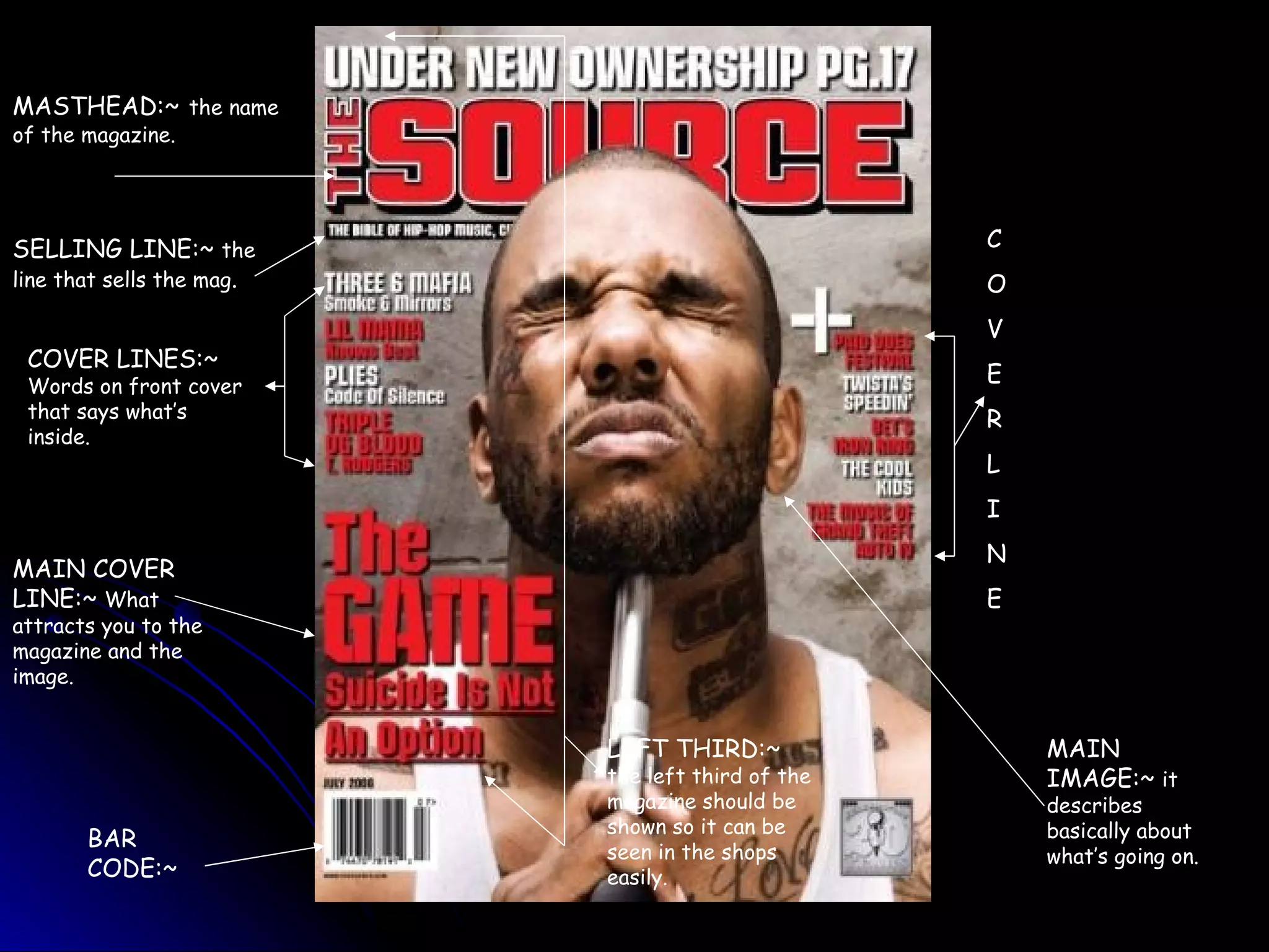 This document provides guidance on key elements magazines should include on their covers to attract readers, including the masthead, selling line, cover lines describing the magazine's content, a main cover line and image that conveys what the magazine is about, and showing the left third of the cover to display in stores. It emphasizes using the cover to clearly communicate what readers will find inside and entice them to purchase the issue.