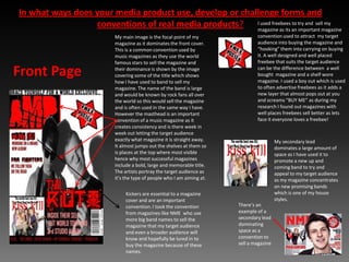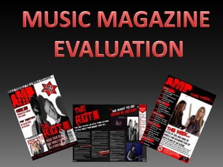 The document provides an evaluation of a music magazine media product. It discusses how conventions from real music magazines were used and developed, such as using freebies and prominent images on the cover to attract audiences. Formatting conventions like mastheads, kickers, barcodes and pull quotes are also discussed. The target audience is identified as 16-25 year old rock music fans through research. Technologies learned through the process include Photoshop skills and using photography equipment. Partnering with a large publisher like IPC to distribute the magazine internationally is proposed. Overall, progress from an initial college magazine to a more polished music magazine incorporating industry conventions is reflected on.