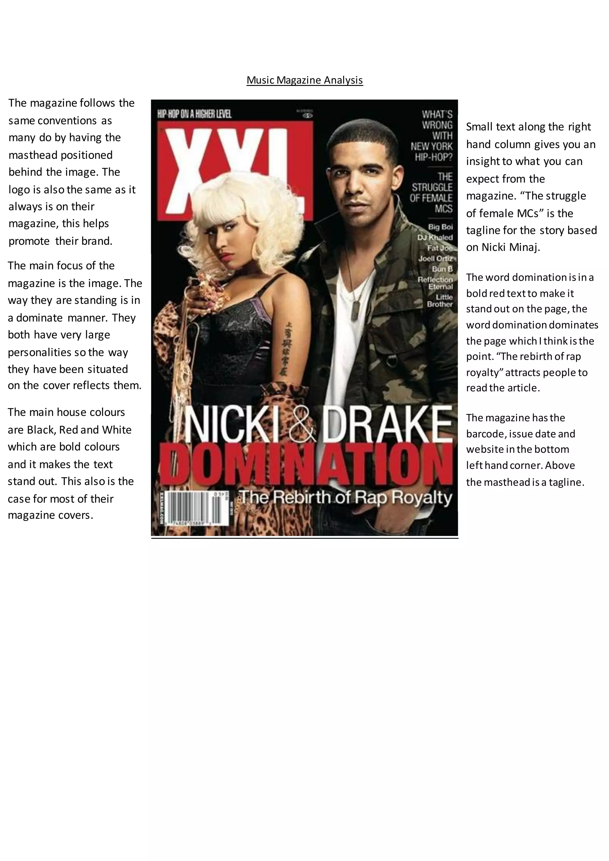 This document provides a detailed analysis of the layout, design elements, and conventions used across multiple pages of a music magazine. Key points include:
