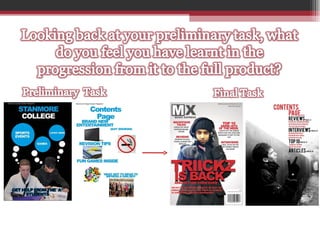 The document provides an evaluation of the student's music magazine media product. It describes how the magazine follows conventions of real media products through elements like the masthead, focal image on the cover, main cover line, additional cover lines around the image, barcode and pricing on the back, contents page layout, and double page article spread layout. It also analyzes how the magazine represents its target social group through images, language, and content choices.