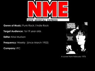 1) NME (punk rock/indie rock magazine from 1976) uses a limited color scheme and large images on the cover to attract readers. The contents page neatly lists articles and bands. Features use photos and distinct text formatting.