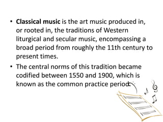 Classical music developed from roughly the 11th century to present times, with the central norms codified between 1550-1900 known as the common practice period. The major time divisions within classical music are the Medieval (500-1400), Renaissance (1400-1600), Baroque (1600-1750), Classical (1750-1830) and Romantic (1815-1910) periods, each with distinct musical characteristics and developments.