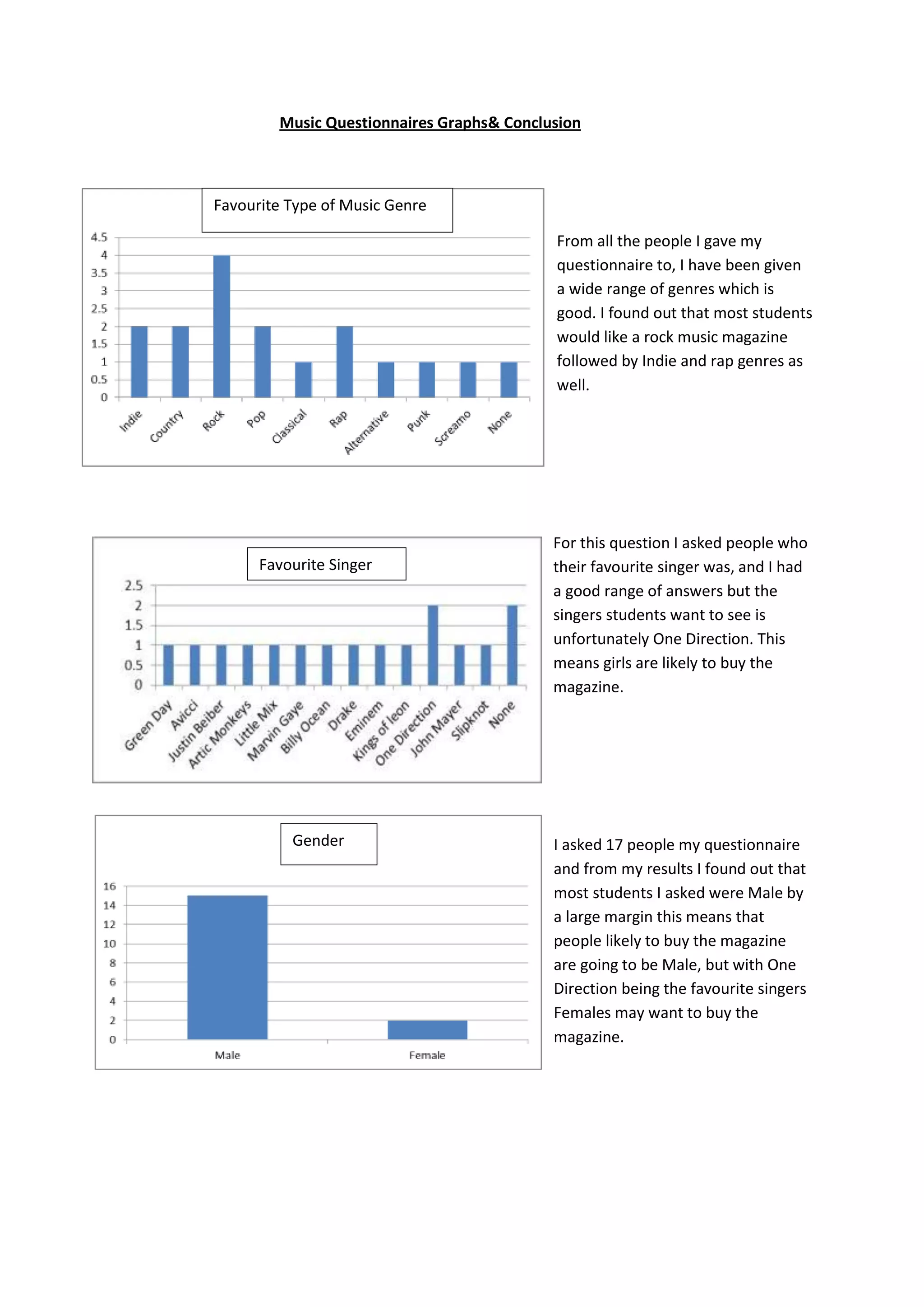 From surveys of 17 students, the author found that rock music was the most popular genre, followed by indie and rap. One Direction was the most popular singer, indicating the magazine may appeal more to female readers. Most respondents were male, but the magazine could still attract female readers due to the popularity of One Direction. The target audience would be 16-17 year old students, as surveyed, who preferred to read Kerrang magazine and typically purchased magazines in shops.