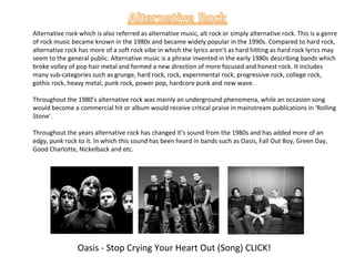 Alternative rock originated in the 1980s as a genre that broke from pop music trends and had more focused and honest lyrics. It includes subgenres like grunge, punk rock, and power pop. Throughout the 80s, alternative rock was mainly underground but some songs achieved commercial success. In the following decades, it took on a more edgy punk rock sound from bands like Green Day and Nickelback.