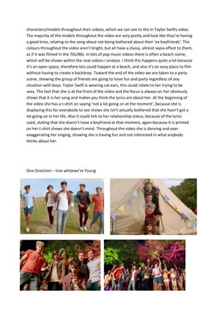 This document analyzes and compares three pop music videos - Taylor Swift's "22", One Direction's "Live While We're Young", and an unnamed upcoming video from the author - in terms of their genre conventions. It notes that Taylor Swift's "22" video depicts a house party scene showing her having fun with friends without worrying about boys, featuring fashionable models and a retro color palette. It also discusses beach scenes being a common backdrop in pop videos. For One Direction's "Live While We're Young", the document highlights its use of bright colors, lights, outdoor scenery and inclusion of many people to emphasize the song's party theme.