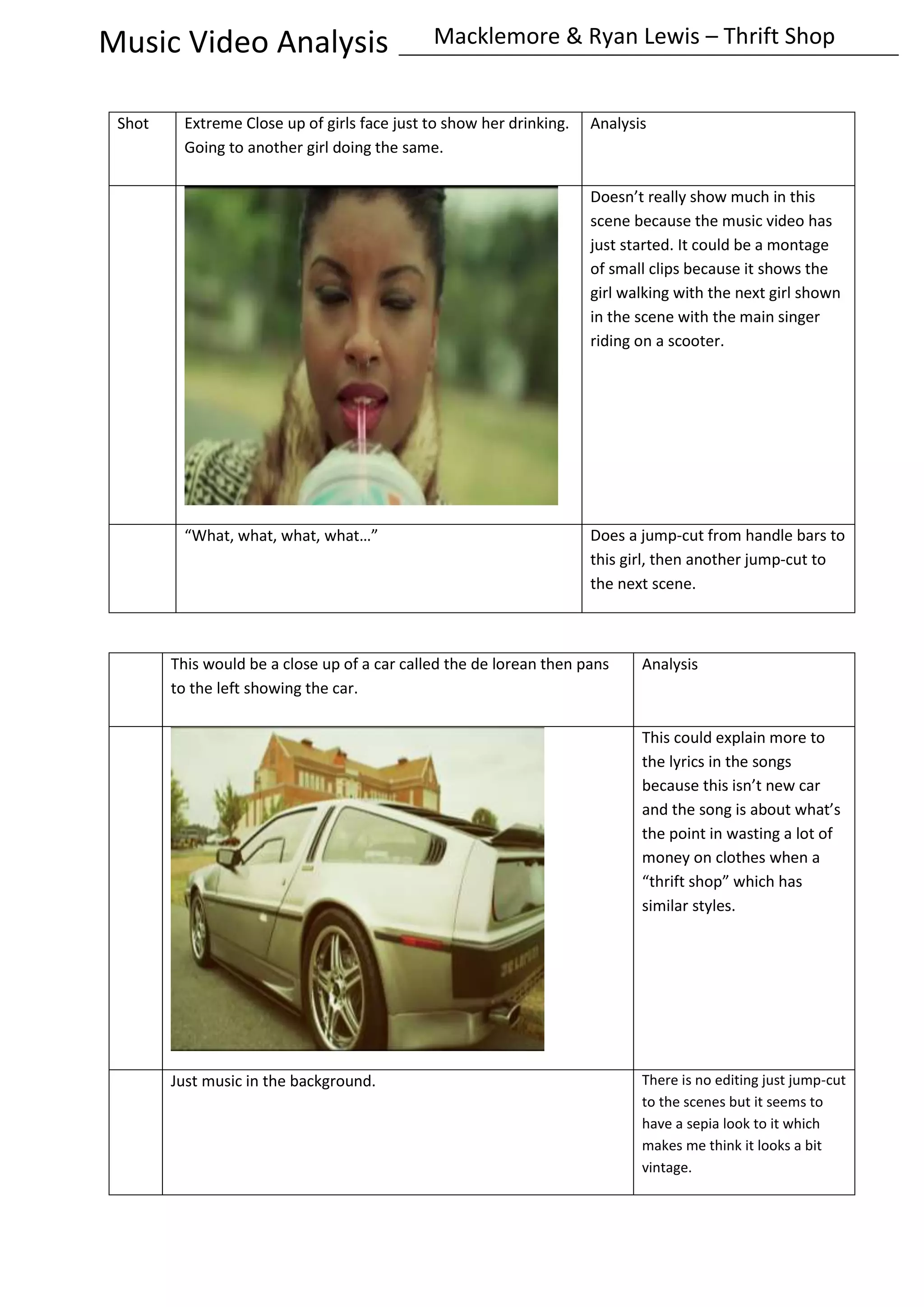 This document analyzes scenes from the music video for Macklemore & Ryan Lewis's song "Thrift Shop". It summarizes three scenes: 1) A montage of girls drinking with jump cuts between them. 2) A close-up of a DeLorean car that relates to the song's lyrics about not needing expensive things. 3) A mid-shot of shoes followed by a person talking about them, showing that society values expensive clothing. The analysis notes that the video uses jump cuts between scenes and has a sepia tone, giving it a vintage look.