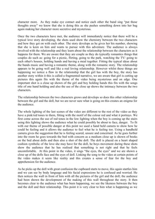 The document provides details about the storyline and visual elements of an indie music video. It describes setting up a sense of mystery by not clearly showing the main character's face or where she is going. Her feminine and predatory nature is conveyed through her clothing and surroundings. Shots of a doll are meant to suggest something is not quite right. The character pursues a romantic relationship with a boy, but the audience sees she is also obsessed with cutting out pictures of herself and a doll, hinting at flaws in the relationship. At the end, the boy discovers a wall of these pictures and realizes he has been replaced like other boys, who he then finds imprisoned. The video aims to challenge conventions while creating an unsettling