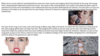 The music video for Miley Cyrus's "Wrecking Ball" directly relates to the song's lyrics through visual imagery of Cyrus swinging naked on a wrecking ball. Her nudity represents vulnerability after a relationship ends. Scenes show Cyrus linking a hammer, enjoying the pain. The video starts with a close-up of Cyrus singing softly while crying, matching the song's slow start. When the song picks up, so does the video, cutting to Cyrus swinging wildly. The video can also be seen as sexually oriented due to nudity and camera focus on Cyrus's body, intended to attract audiences.