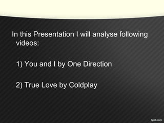 The document analyzes the music videos "You and I" by One Direction and "True Love" by Coldplay. It discusses the camera angles and shots, mise-en-scene, and editing techniques used in both videos. For "You and I", it examines the close-up shots showing character emotions, high and low angle shots involving the viewer, and over-the-shoulder shots. Mise-en-scene elements like beach backgrounds, innocent clothing, and props are also discussed. Editing techniques like character transitions and duplicate positions are highlighted. The analysis of "True Love" similarly looks at establishing shots, extreme close-ups, overhead shots, and how lighting and props are used to match the music