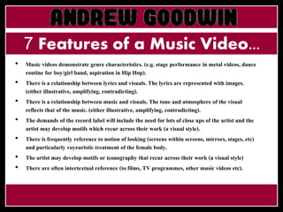 Wolf Alice is a four-piece alternative rock band from London. Their music video for "You're a Germ" tells a horror narrative story through exaggerated facial expressions and amplified scenes that represent the lyrics. There are clear relationships between the lyrics, music, and visuals as events in the video heighten with the music and specific shots represent lyrics. Close-ups are used to focus on lead singer Ellie Rowsell and allow the audience to follow the story from different perspectives without directly addressing the camera like a conventional performance video.