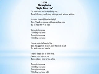 This document provides an analysis of the music video for the song "Maybe Tomorrow" by the band Stereophonics. It discusses various technical and artistic elements of the video, including its black and white retro style, camerawork, editing techniques, use of diegetic and non-diegetic sound, and how the video relates to the lyrics and mood of the song. It analyzes how the video portrays the lead singer Kelly Jones as lonely and struggling with the pressures of fame, relating this to lyrics in the song. It also notes how the video focuses heavily on close-ups of Kelly Jones to promote him as the artist, in line with record label demands.