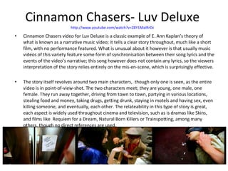 The music video for Cinnamon Chasers' "Luv Deluxe" tells a narrative story without lyrics by using effective mis-en-scene and point-of-view shots. It follows two characters who meet, run away together partying and taking drugs in various locations, until eventually killing each other. The Naked and Famous' "All of This" video is predominantly a performance video, but also includes symbolic shots of objects relating to the lyrics. Robyn's "Be Mine" combines a performance video with narrative elements as she encounters an ex while singing about unrequited love.