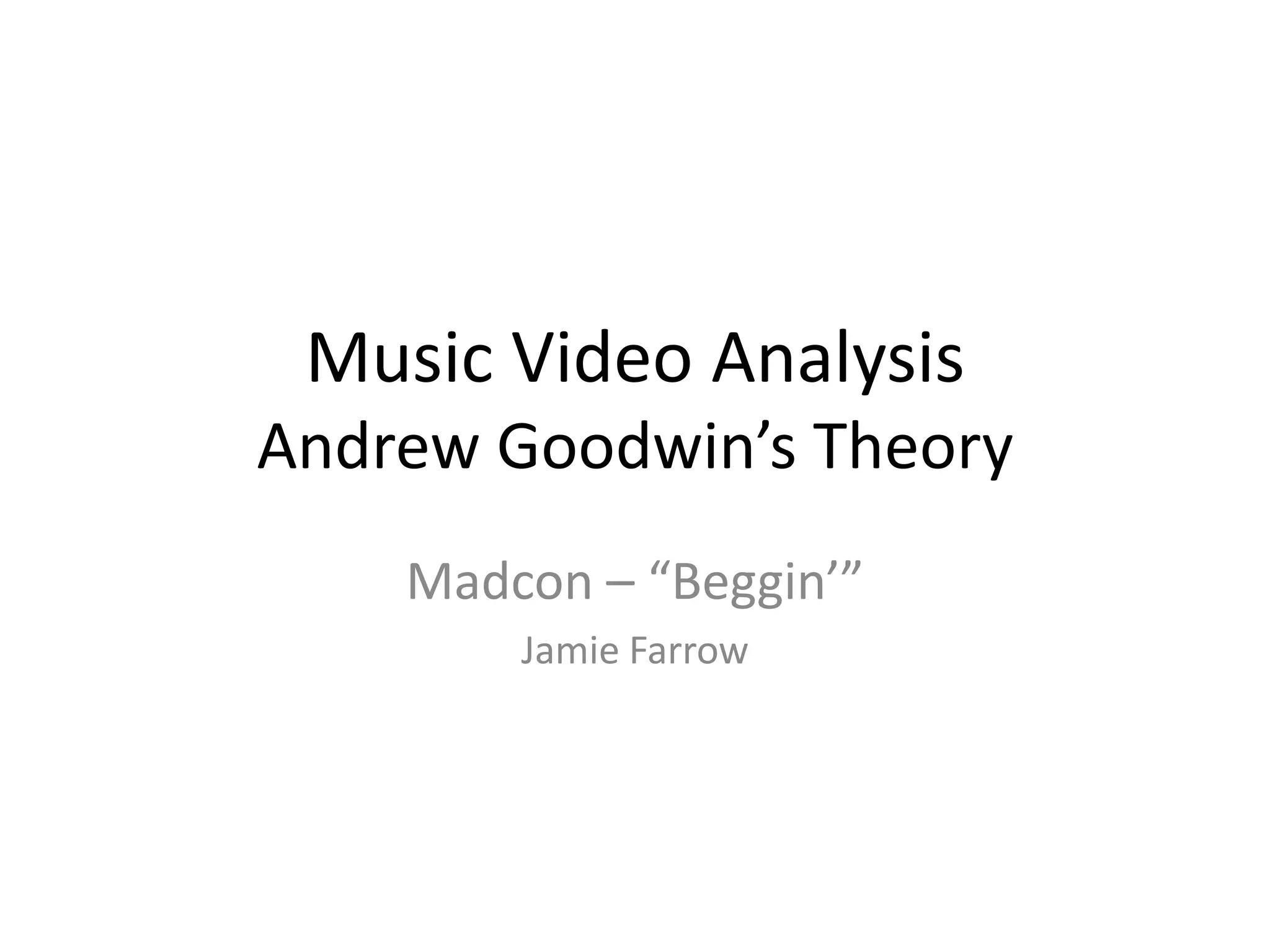 This document analyzes Andrew Goodwin's theory on the key aspects that are commonly featured in music videos. It discusses 6 aspects: 1) Demonstrating genre characteristics through performances and routines. 2) Relationships between lyrics and visuals through actions, scenery and actors. 3) Relationships between music and visuals that can be illustrative, amplifying or contradictory. 4) Including close-ups of artists to promote them and developing visual motifs. 5) Referencing notions of looking and treating the female body voyeuristically. 6) Making intertextual references to other media like films and other music videos. The document then analyzes the music video for "Beggin'" by Madcon based on these 6 aspects