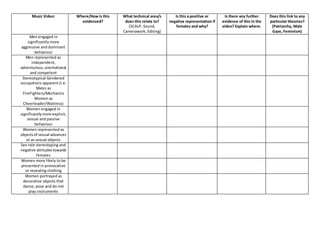 This document discusses how gender is represented in music videos and relates to theories of patriarchy and the male gaze. It notes that men are typically portrayed as independent, competent and unemotional while engaging in more aggressive behaviors. Women are often presented as sexual objects, depicted in revealing clothing, and portrayed in stereotypical gender roles like cheerleaders or waitresses. They also engage in more passive and sexualized behaviors. These representations promote negative attitudes and sex role stereotyping of females.
