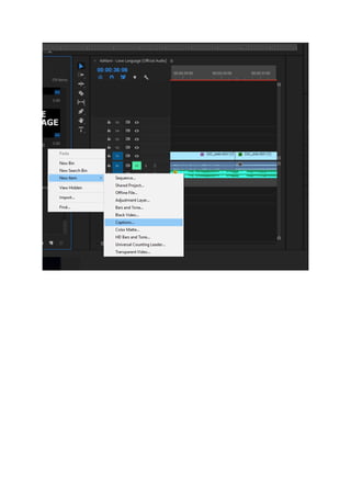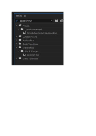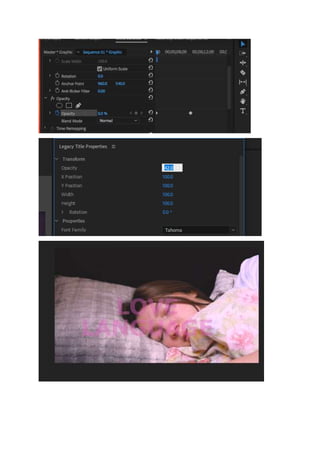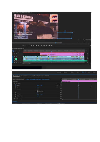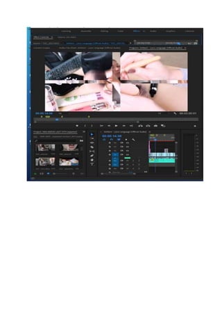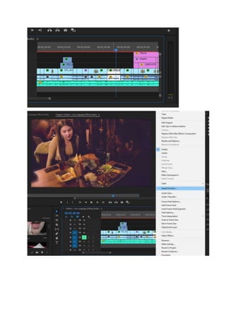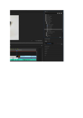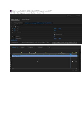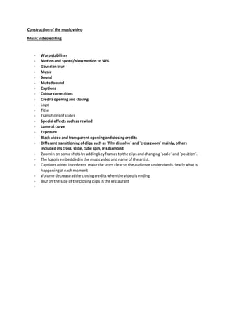 This document provides instructions for editing a music video using Adobe Premiere Pro. It describes various editing techniques used such as adding captions, color corrections, speed adjustments, transitions, effects like motion blur and rewind, and incorporating opening and closing credits. Procedures for applying these different edits are explained in detail through screenshots and step-by-step descriptions. The overall goal of the edits was to improve visuals, synchronize with the music, and tell the story clearly for the target demographic of 16-25 year olds.