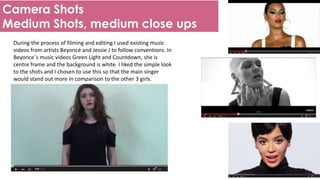 The student created a music video that followed many established conventions through their use of camera shots, makeup, costumes, editing techniques, lighting, and lip syncing. Medium shots of the main singer against a plain white background took inspiration from Beyoncé's videos. Close-up shots of the singer looking at the camera drew from Ciara's "I Bet." Split screens, color-matched makeup, and lip syncing also emulated techniques from popular artists' music videos. However, the student challenged conventions somewhat by keeping the entire video shot in a single, continuous location using a green screen background.