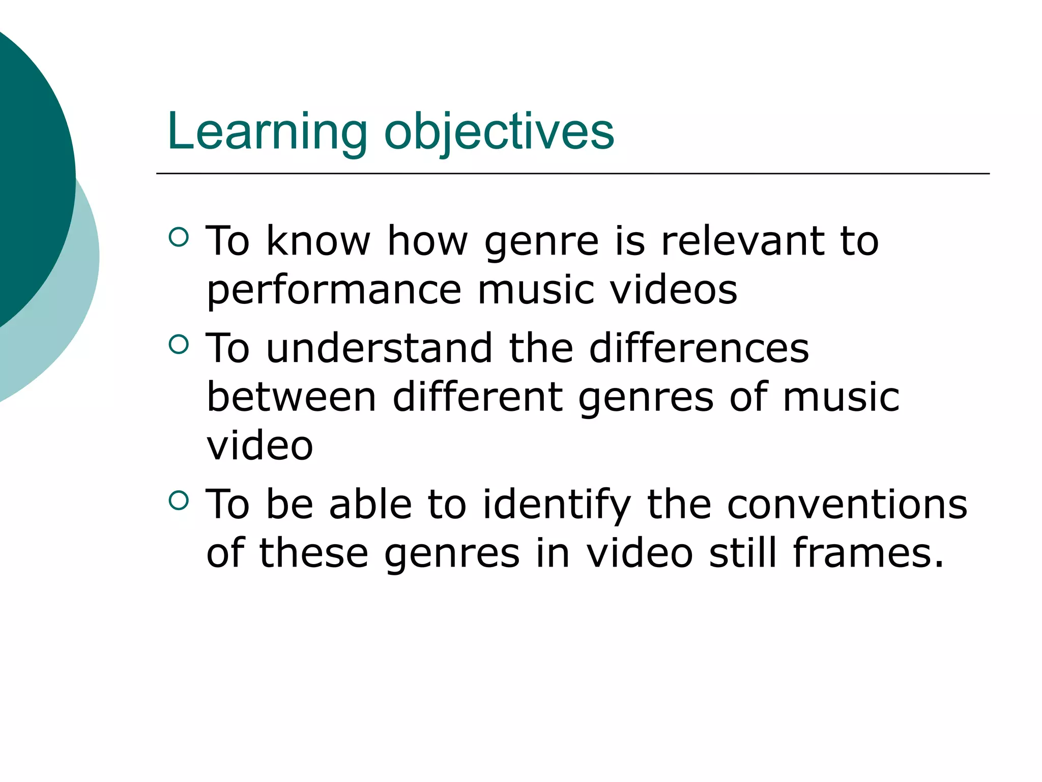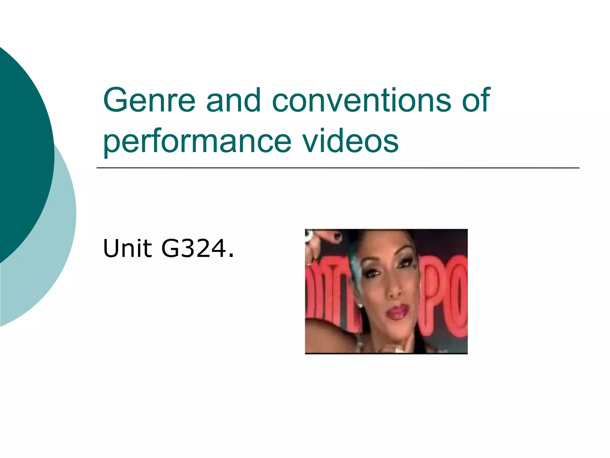 This document discusses the conventions and genres of performance music videos. It defines genre as a system of repetition and variation that is recognized by audiences. Common music genres discussed include pop, rock, R&B, hip hop, and indie. The document also examines important elements of mise-en-scene in music videos like setting, lighting, clothing, and props that help portray the genre. Specific conventions for hip hop, indie/rock, and pop genres are provided through example music videos.