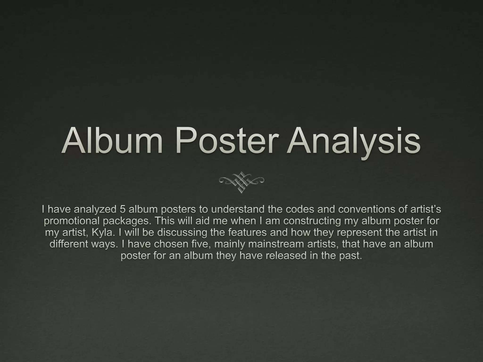 The document analyzes several album posters, including those for Rihanna's "Loud" album, Eminem's "Recovery" album, and 5 Seconds of Summer. Key details analyzed across the posters include prominent placement of the artist and album names, inclusion of the release date and tracklist, use of imagery relating to the artist or album concept, and fonts and colors that promote recognition and match the artist's branding or musical style. Common conventions like these help attract audiences and promote album sales.