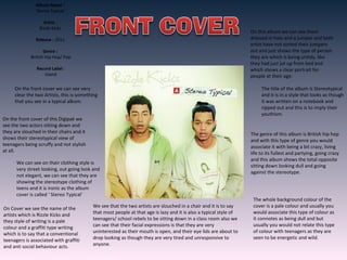 The album cover for Rizzle Kicks' 2011 album "Stereo Typical" portrays the duo in a scruffy, lazy manner that goes against stereotypes of hip hop artists. They are slouched casually dressed in the chairs with tired facial expressions. While the album genre is British hip hop, the cover presents a dull, unconventional image compared to the artists' usual lively personas. Throughout the booklet and lyrics, additional clues suggest the artists aim to subvert expectations through their "stereotypical" appearance and song titles.