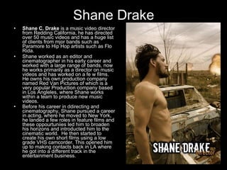 Shane Drake is a music video director from Redding, California who has directed over 50 music videos working with major artists from Paramore to Flo Rida. He got his start in the industry as an editor and cinematographer and now runs his own production company called Red Van Pictures based in Los Angeles. Drake is known for his creative visual styles and strong use of lighting, camera work, and narrative elements to reflect the mood and message of the songs he directs videos for. Some of his most acclaimed works include videos for Panic! At The Disco's "I Write Sins Not Tragedies" and Paramore's "Decode".
