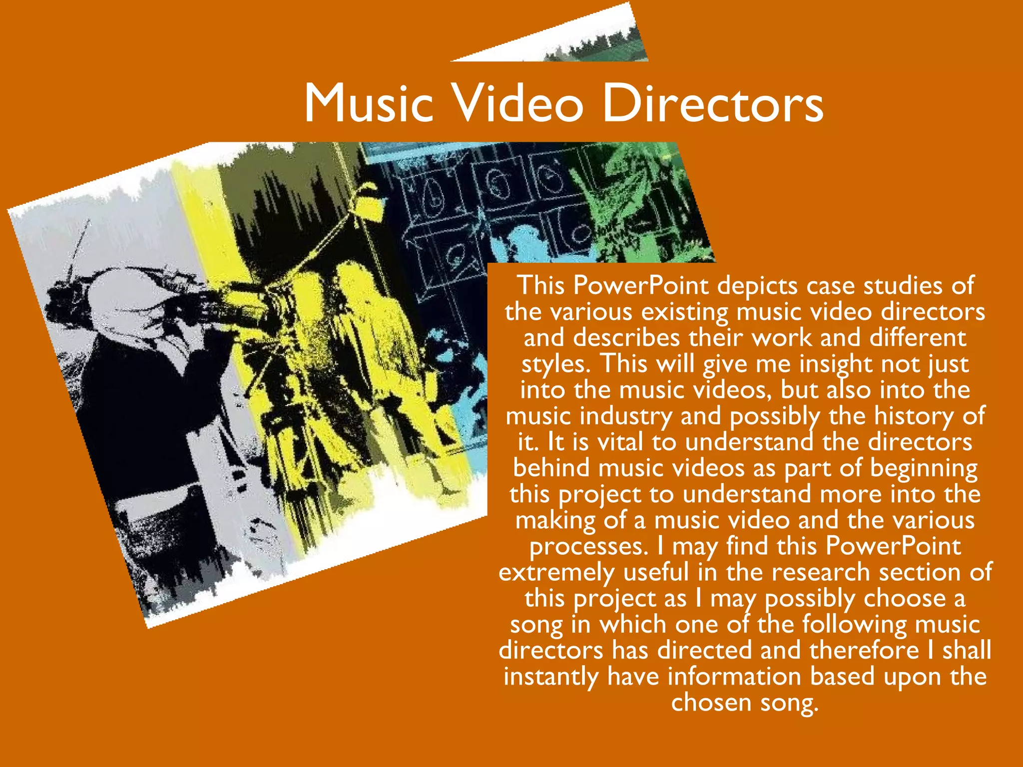 This document provides case studies of several prominent music video directors, including Jonas Akerlund, Spike Jonze, Michael Bay, Chris Applebaum, and David Fincher. It describes their backgrounds and styles. It notes that understanding the directors behind music videos is important for research into how music videos are made and the music industry overall. The document concludes that gaining an in-depth knowledge of music video production through further research is crucial before making a music video.