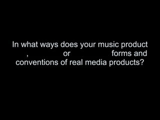 The music video matches the conventions of the alternative rock genre through its lyrical references, slow pacing, and desaturated color scheme. Audience feedback found that most understood the theme of forbidden love and matched the video to the song. Suggested improvements included improving the lead singer's miming and stabilizing camera shots. New media technologies used included YouTube for research, Adobe software for editing and design, and online surveys for evaluation.