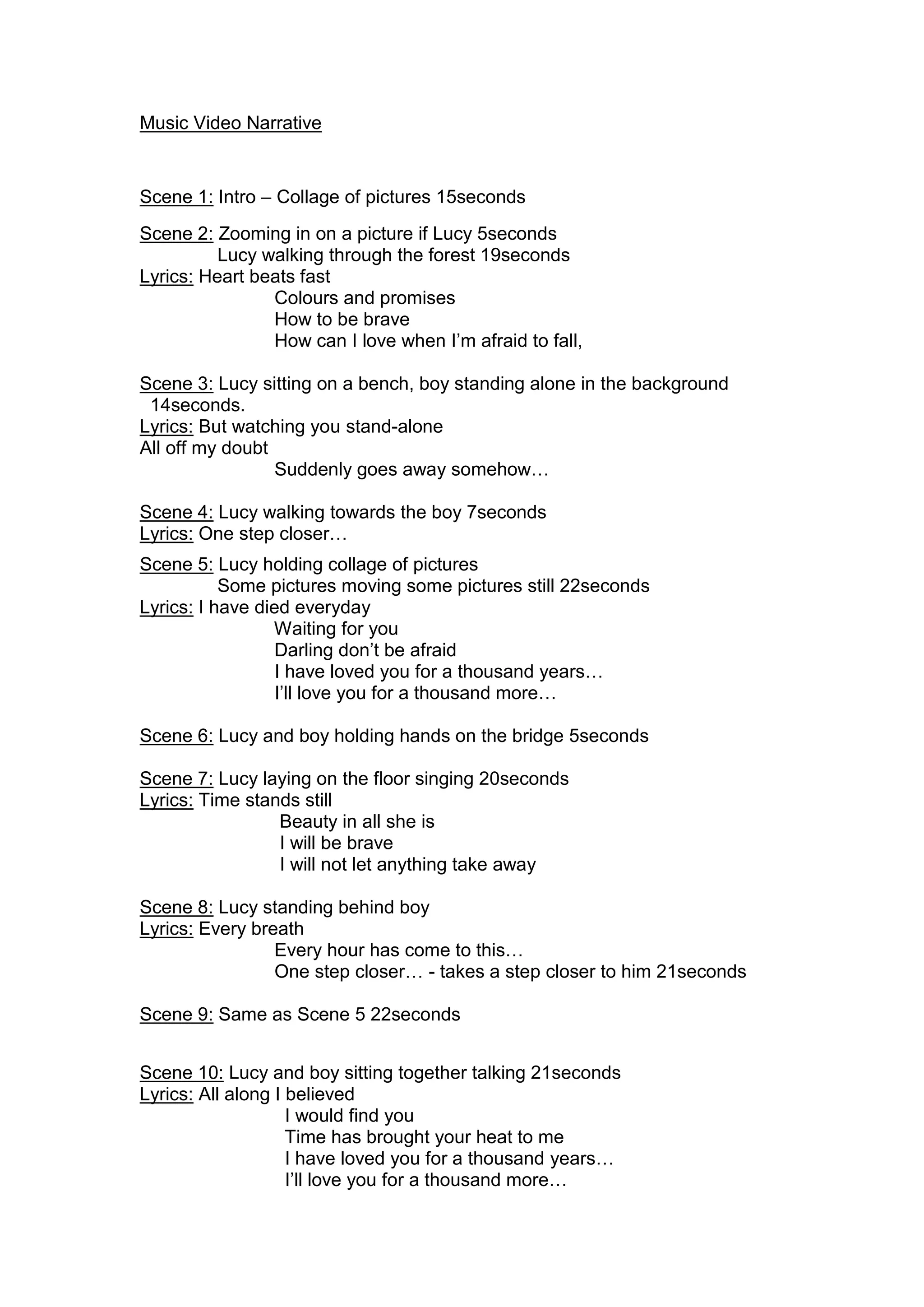 The music video narrative describes 17 scenes depicting the story of a girl named Lucy and her journey to connect with a boy. The scenes show Lucy walking alone in the forest, sitting on a bench watching the boy from afar, and gradually getting closer to him through interactions like holding hands on a bridge and sitting together talking. Interspersed lyrics from the song describe Lucy's fear of love but willingness to be brave and her belief that she will find the boy, having loved him for a thousand years. The narrative culminates with Lucy and the boy lying on the floor together, indicating their relationship has developed.