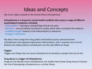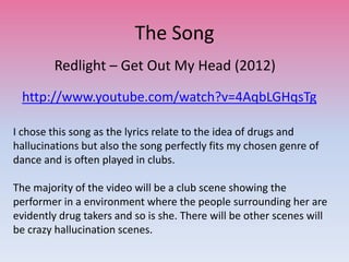 The document provides details about a proposed music video that will tell the story of a drug addict who develops schizophrenia. It will show her regularly experiencing hallucinations as she abuses drugs, unaware that she has a mental illness. The video will include scenes of her in a club surrounded by other drug users, as well as scenes depicting her drug-induced hallucinations. It will incorporate conventions of dance music videos like lighting, camerawork, and close-ups, while also including a narrative element to portray the effects of drugs on mental health.