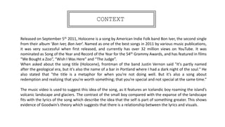 The song "Holocene" by Bon Iver was released in 2011 and was very successful. The music video features an Icelandic boy wandering the island's volcanic landscapes. This contrasts the small boy with the vast expanse of the landscape, mirroring the song's lyrics about feeling small yet part of something greater. The video uses the boy instead of the band to make the audience feel more sympathetic. It follows Goodwin's theory of relating the visuals to the lyrics to help the audience engage more with the song.