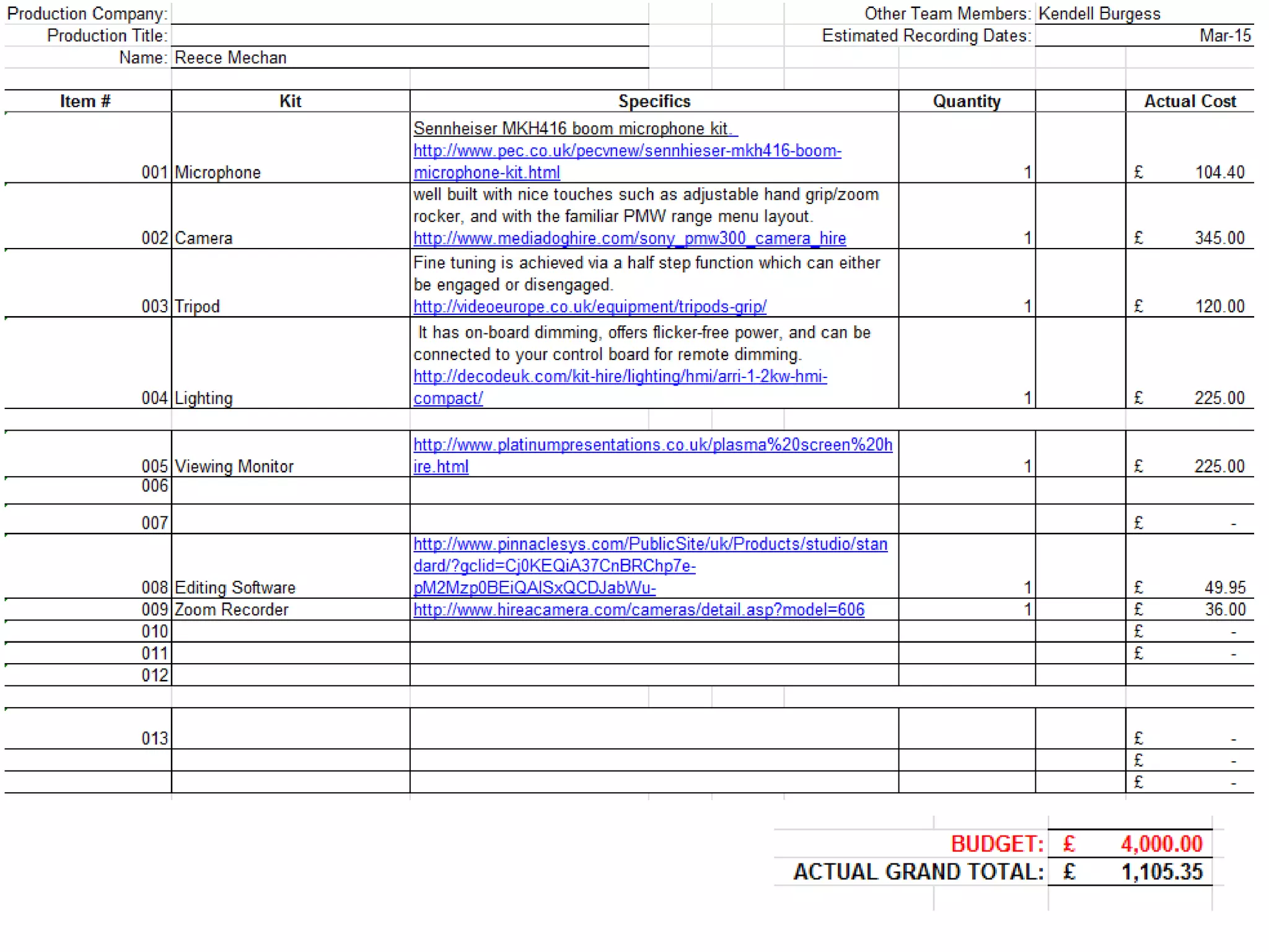 This document lists the essential equipment needed for music video production including a light tripod, camera, boom microphone kit, viewing monitor, zoom recorder, and budget for costs. The listed items provide the basic hardware required to capture video and high quality audio for a music video shoot.