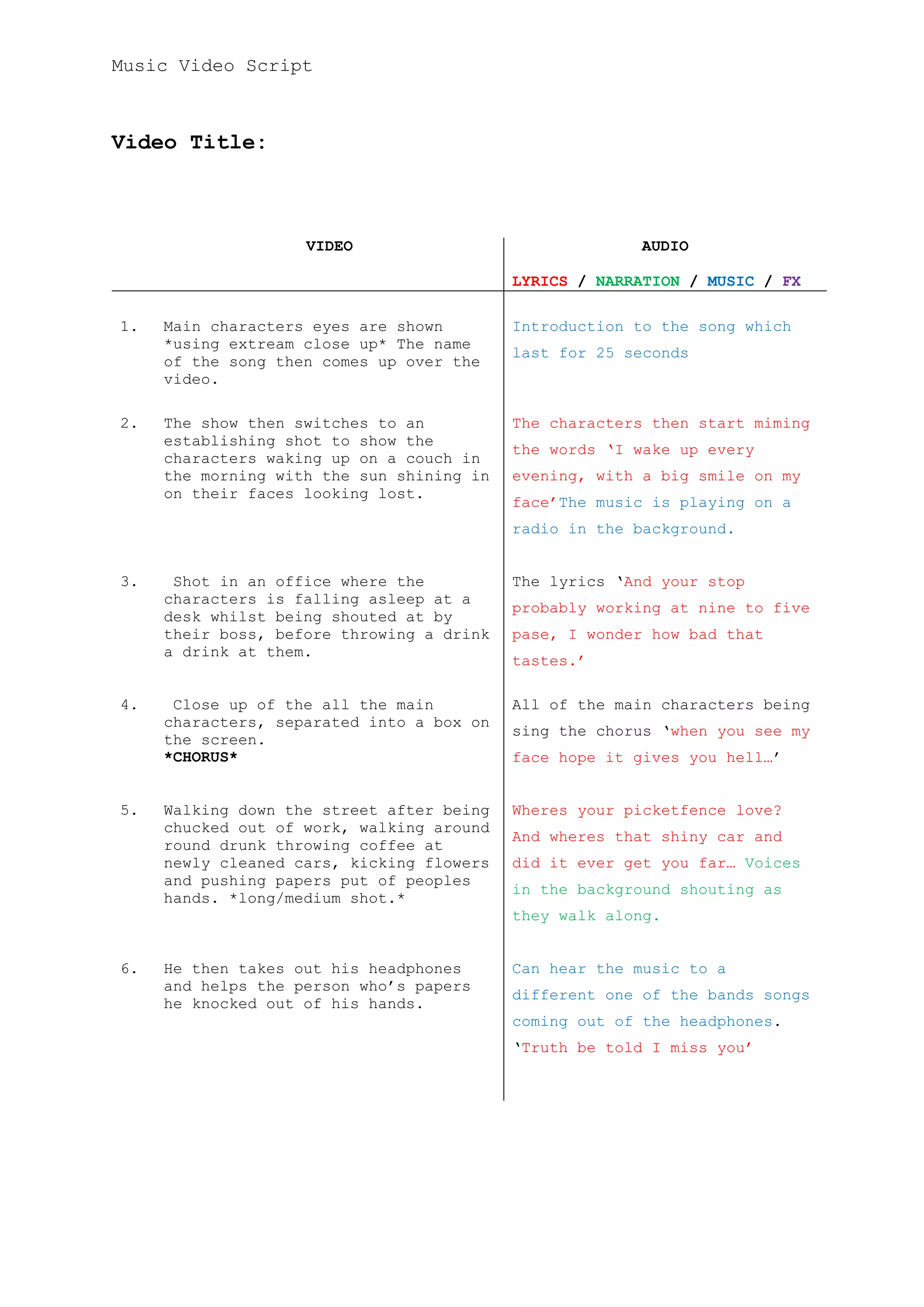 This music video script follows various characters and depicts scenes representing the lyrics of a song. It includes 13 scenes with descriptions of visuals and audio/music for each. The visual descriptions involve shots of the characters waking up, arguing with partners, getting fired, dancing at work, and finally all singing together on a couch. The audio incorporates lyrics, narration, and music/sound effects matching each scene. The script is formatted with video and audio columns to clearly distinguish visual and audio elements for production of the music video.